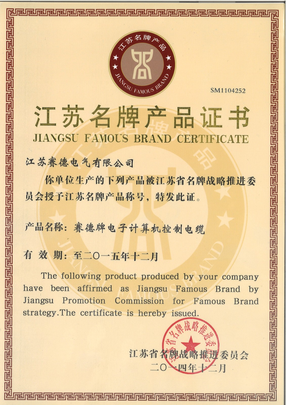 | 20 | 江苏省名牌产品证书 |